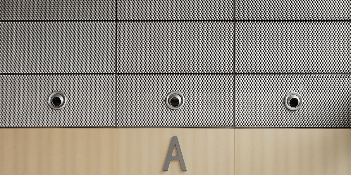 The full-length glass walls on the north and south allow the lobby to absorb the greenery from the forecourt and the back gardens. The interiors are clad with stretched aluminum panels covering the span of the sidewalls and ceiling like a champagne-colored curtain. The metal screen partially conceals areas overlooking the atrium, and hides various fixtures, lending the space an elegantly modern and minimalist character.