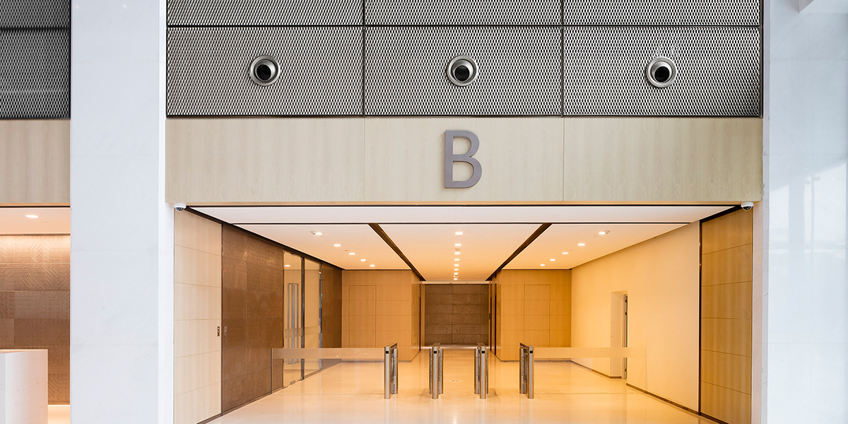 The white Carrara marble cladding the columns extends to the ceiling to form a grid of columns and beams, and sets the rhythm derived from the building’s structure. The reception and lift lobbies were conceived as warm-colored niches, hence the use of Oak veneer to give a soft appearance contrasting with the striking atrium. A long pin-shaped water feature cuts through the lobby, visually connecting the north and south landscapes while creating a peaceful sanctuary perfect for casual sit-downs.