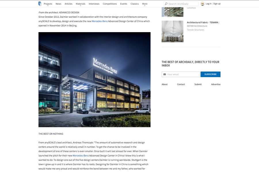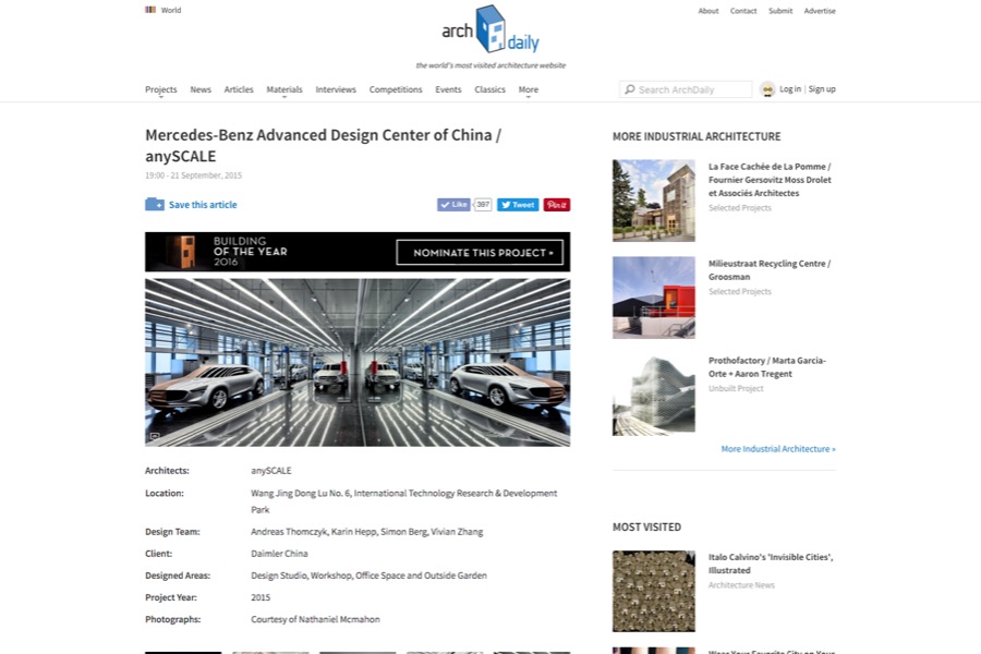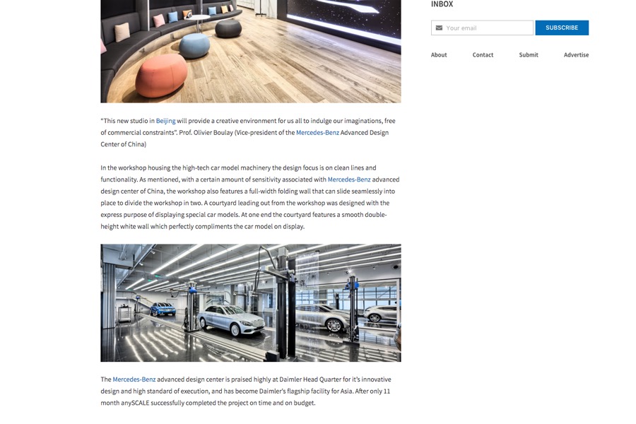 anySCALE’s recent design: Mercedes-Benz Advanced Design Centre of Beijing was published in ArchDaily on September of 2015! ArchDaily is an informative online platform for the architecture and design industry on the latest architectural news. This Automative design centre is currently the only one that exists in Asia, and one of only five that Daimler is running worldwide. The entire project includes a design studio, workshop, an outside garden and innovative office spaces. It took AnySCALE just over one year to complete the entire project. Design by: Andreas Thomczyk, Karin Hepp, Simon Berg, Vivian Zhang.