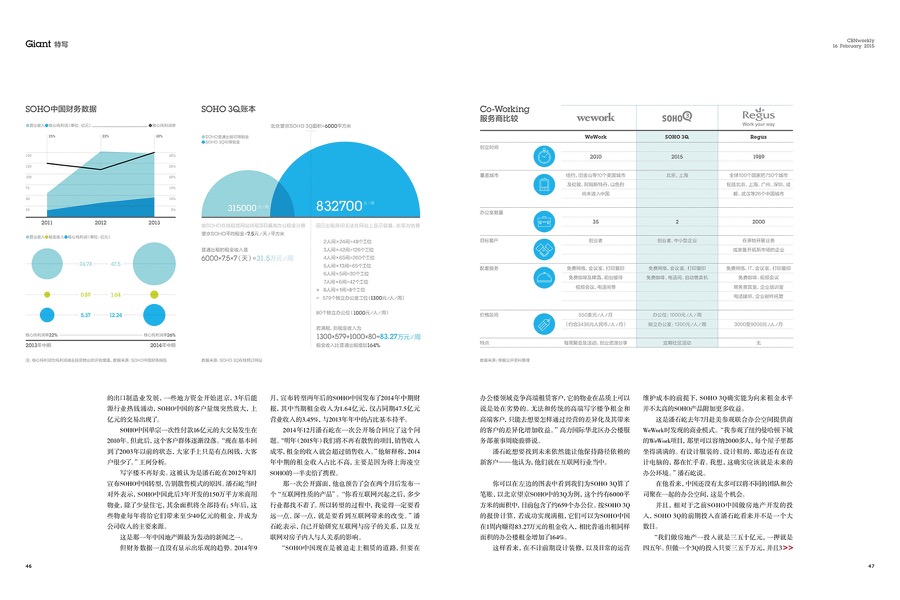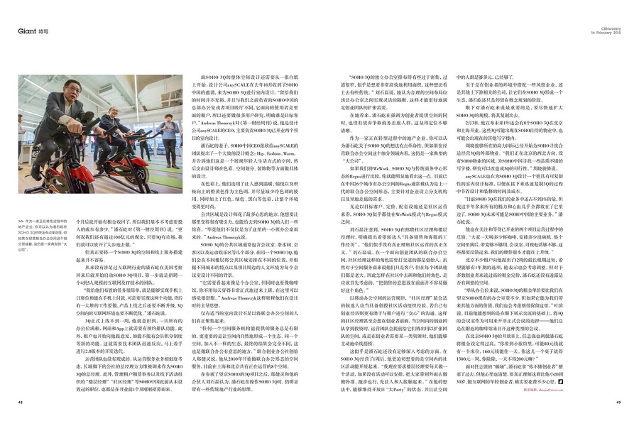 CBN Weekly (China Business Network) featured the SOHO 3Q brand and anySCALE’s work in the 3Q coworking office design on their ‘Giant’ section of the February edition, 2015. This six-page detailed report includes comprehensive information on SOHO 3Q such as its market positioning and business model; it also covers the design concepts behind 3Q as well as the special role anySCALE plays: we are always working on optimising our 3Q designs and we intend to create a more replicable interior design model for the general 3Q brand in order to continually improve on time and cost savings.