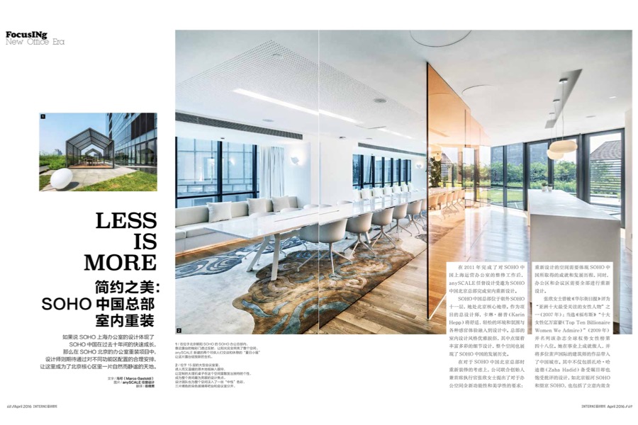 Interni - the magazine of interiors and contemporary design - has featured anySCALE’s renovation design for SOHO headquarter at Chaowai SOHO in its latest publication. The design included a new up-to-date exhibition space in which to display all of SOHO’s architecture models, as well as updating meeting rooms on the executive floor. By rearranging the configuration of different functional areas, Karin Hepp (project’s lead designer) managed to create a natural and cozy space in the core area of Beijing city. Interni Magazine, founded in 1954, is considered an indispensable tool for orientation in the world of interiors and product design.