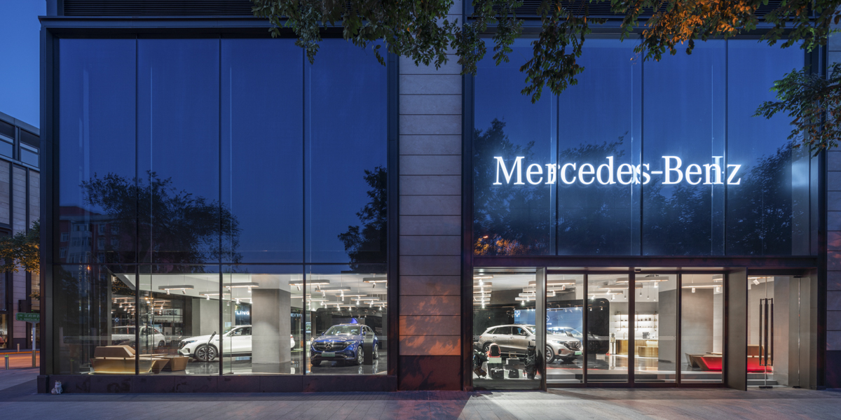梅赛德斯-奔驰旗舰展厅落址于北京环球金融中心新建的高端购物中心一层。店面正对繁忙的交通路口,门头上方巨大的LED屏幕用于产品资讯的播放以及品牌LOGO的展示。参观访客可通过两个主入口进入展厅内部参观浏览,展厅总面积可容纳三辆展车的陈列。
