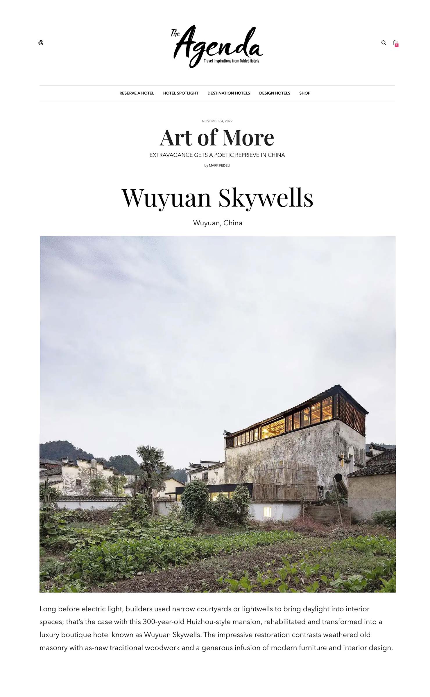 Wuyuan Skywells Hotel gets glowing review in “Art of More – Extravagance gets a poetic reprieve in China”.