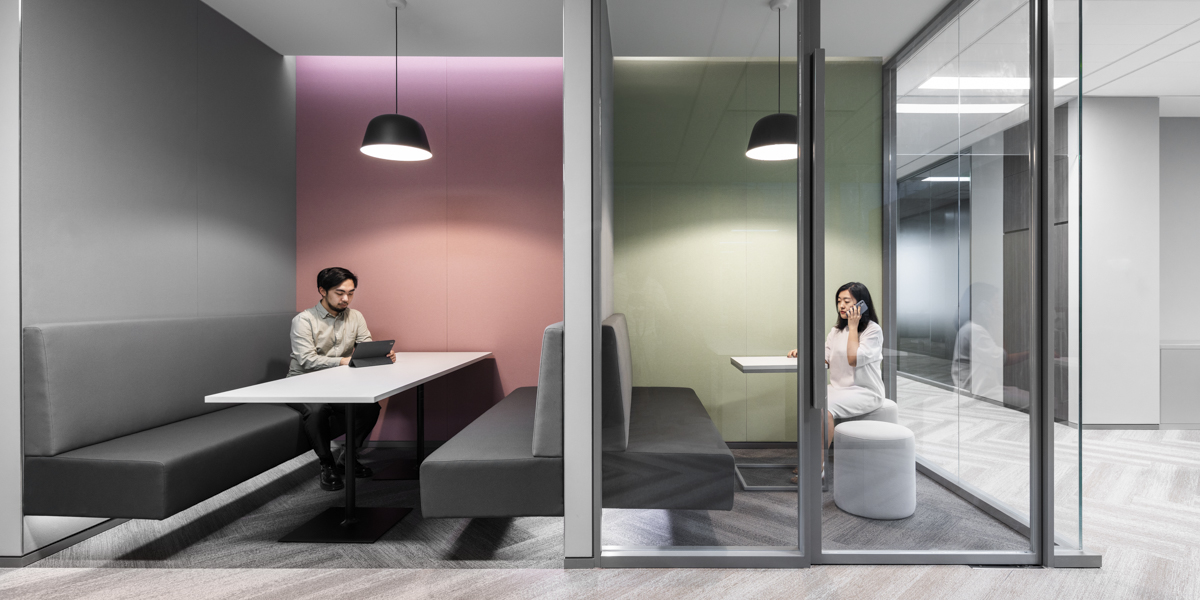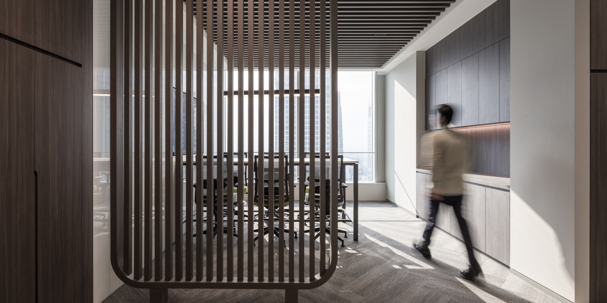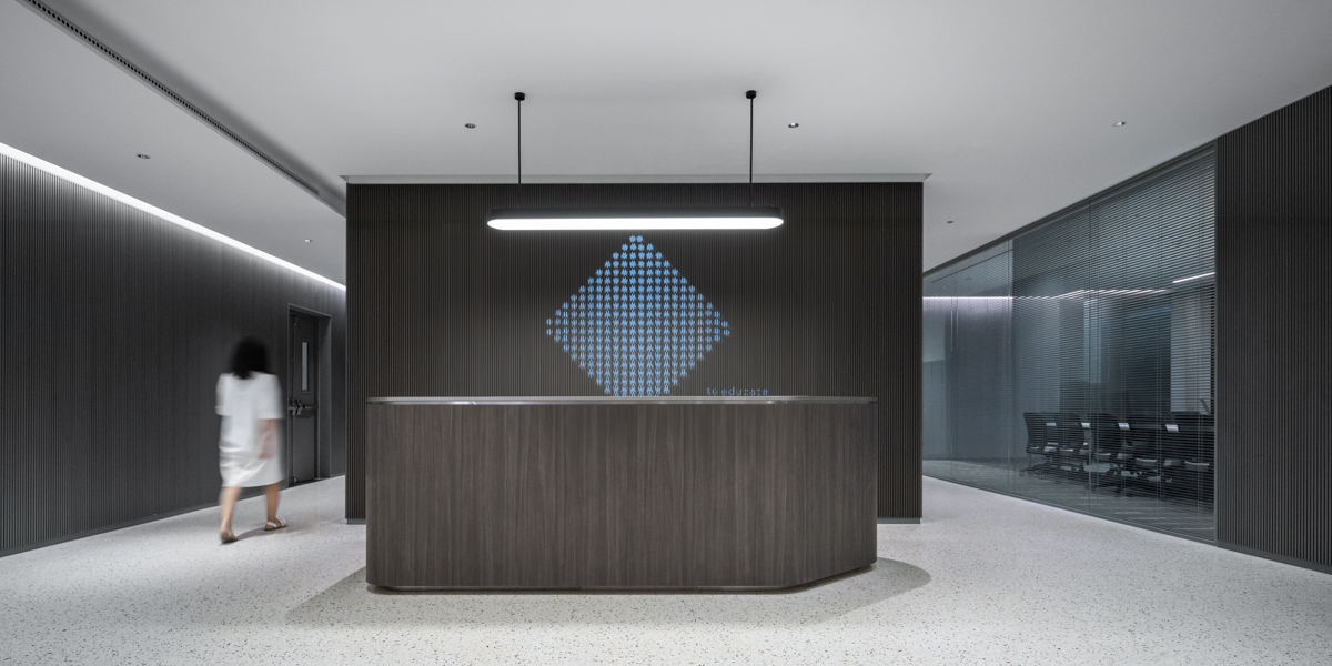 前台区域的地面为水磨石铺装,旁侧会议室的玻璃隔断令窗外的自然光线能够充分倾洒至空间内部。直纹木饰面前台后方的LED屏上持续播放的艺术视频,为空间增加了一抹现代灵动之感。值得一提的设计亮点还包括位于东北角、介于四方走廊与开放办公区之间的茶水间,墙面上用铝板雕刻的世界地图亦象征了正大集团在全球的经营业务范围及客户分布。