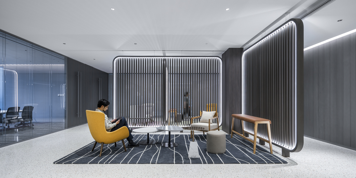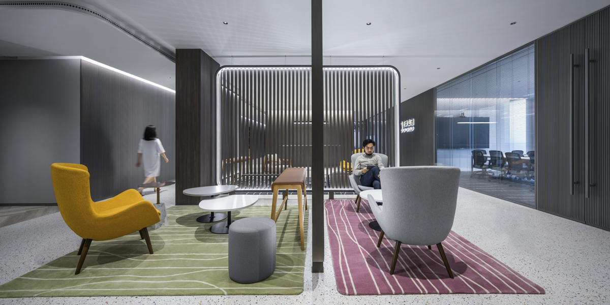 流畅、利落的折线金属板由电梯厅出口一直贯穿至前台区域的整个墙面。为烘托企业整体风格氛围,设计师透过深灰色金属折线板与黑色木纹格栅板的结合,营造出沉稳的深灰色主题基调,搭配色彩缤纷的家具组合以及三维logo造型墙,优雅大气之中不失明亮与活力。彩色块毯的运用区域为空间内的独立等候区,除了色彩上的区分外,设计师运用排列规整的木格栅将这个区域进行功能分隔,除了正对前台,用深蓝色地毯衬托的大型访客等候区外,空间内还设有另外两处由绿色及粉色块毯衬托的小型等候区,分别可容纳2-4人。“如此设计手法能够令前台人员透过格栅间距巧妙的观察到访客的等候情况,避免访客被忽略和冷落。”Thomczyk如此描述道,“这个区域也是非常适合社交的角落”。