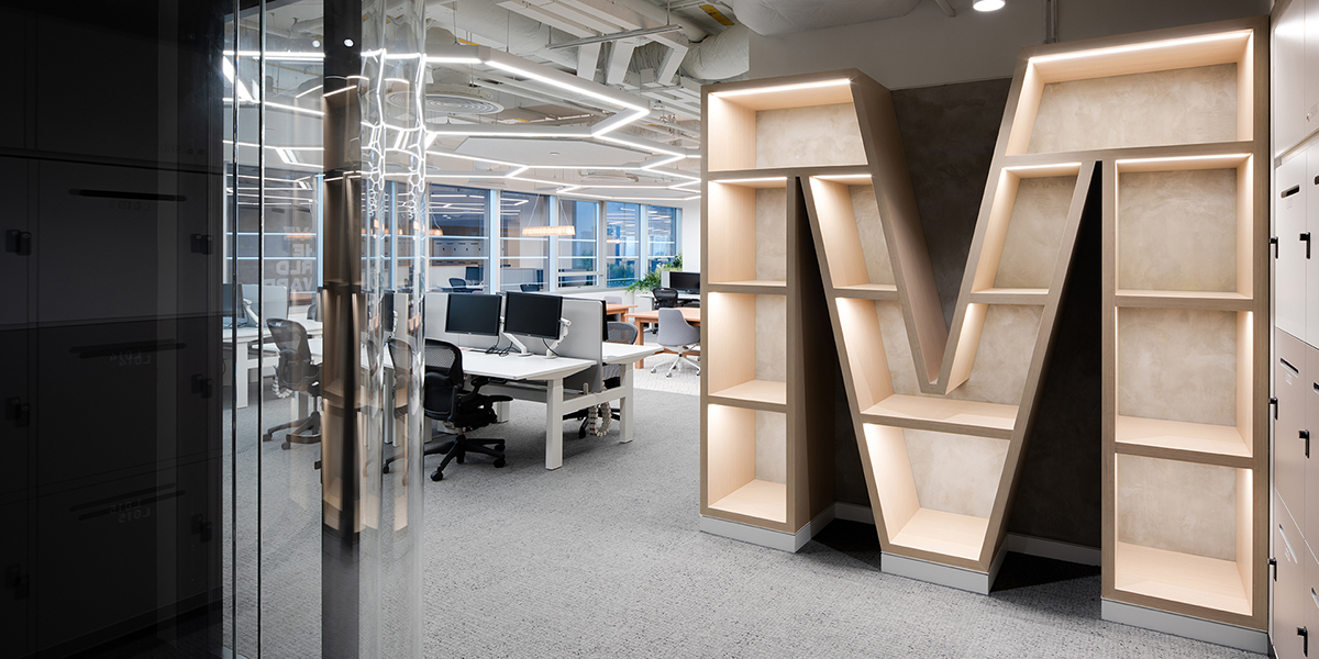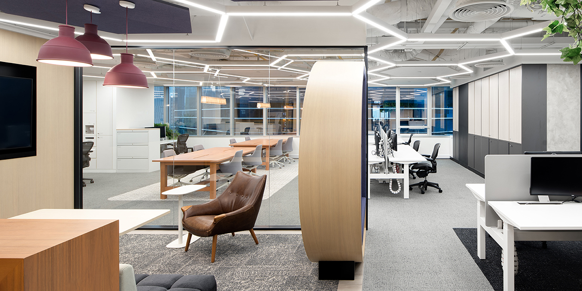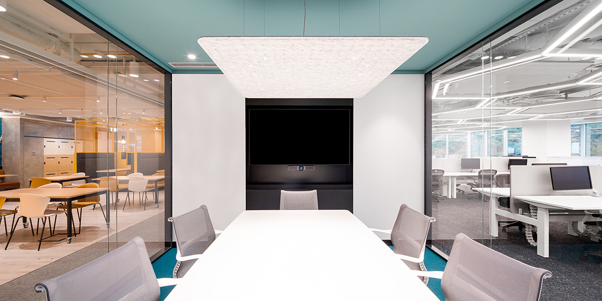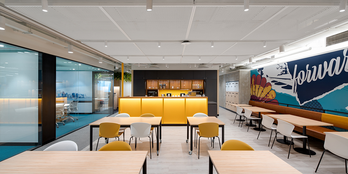 Flanked on both sides are open lounges for more collaborative workspaces, fostering teamwork. Furthermore, all meeting rooms along the facade in the corners have stunning views and eye-catching wallpaper; each one is entirely different, giving a sense of release over stunning harbor views.