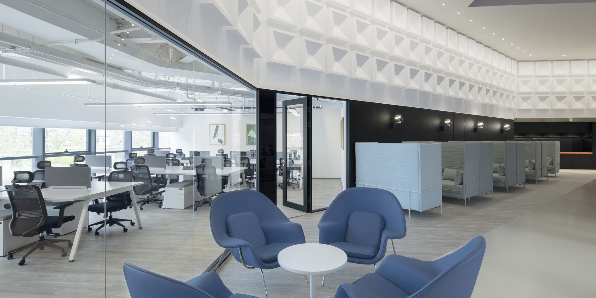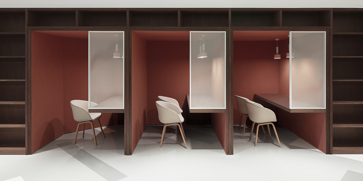 另一个设计主线是在设计元素上,延续了一层多功能厅的声波元素,成排或独立出现的方形造型喇叭此起彼伏,期待这里成为一个传播载体,成为为各个行业新势力的萌芽、成长呐喊助威的平台。