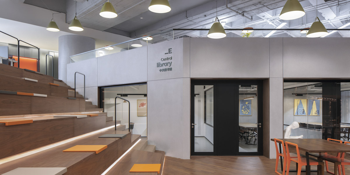 anySCALE将这个阳光下的中庭营造出了一种图书馆的视觉感受,漂浮在宇宙中的、透过天窗可以看到阴晴雨雪的飞船里的图书馆。希望能给在这里学习和工作的人一种活力的,生机勃勃重返大学校园图书馆的感觉。同时,设计团队在这里还融合了以海洋、森林、冰川,和湖泊为设计主题的休闲空间,就如同承载着地球上的珍禽异兽、奇花异草逃离地球的飞船,飞向宇宙。