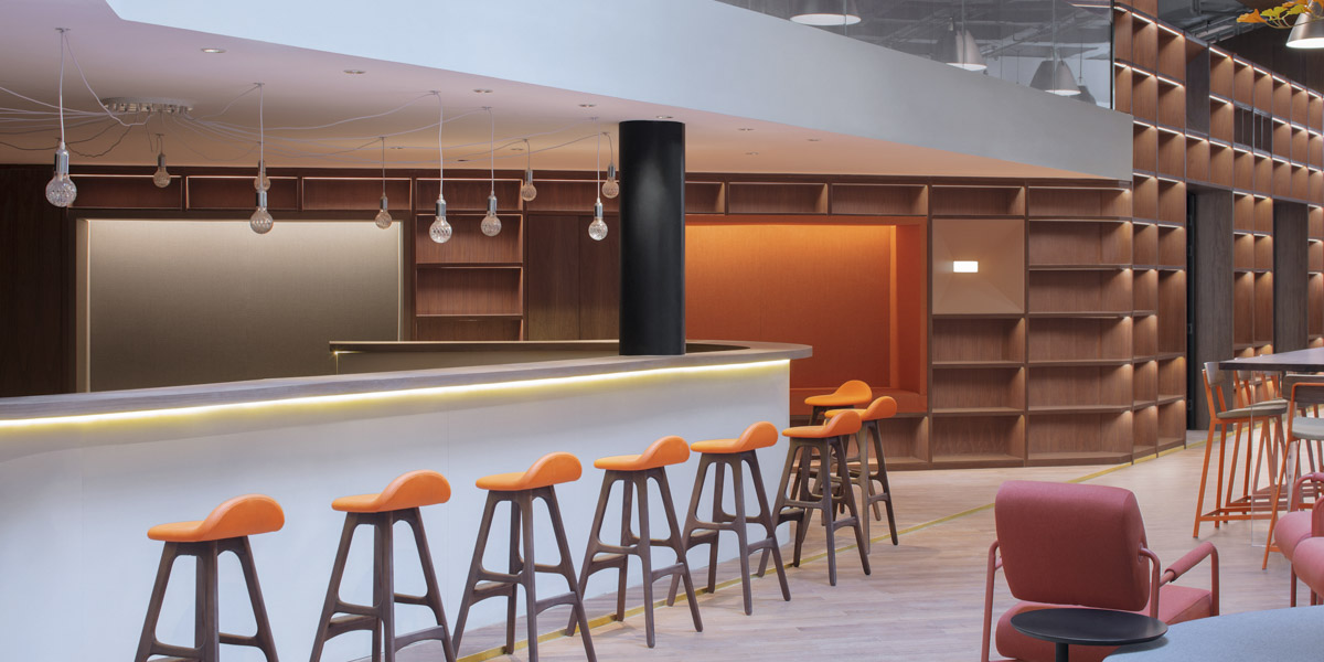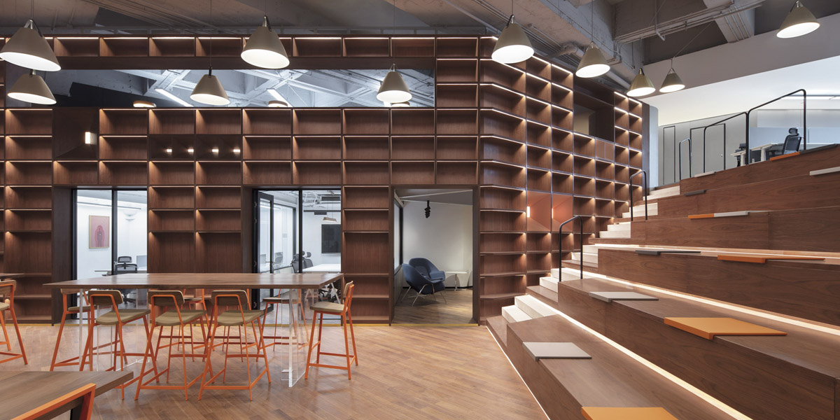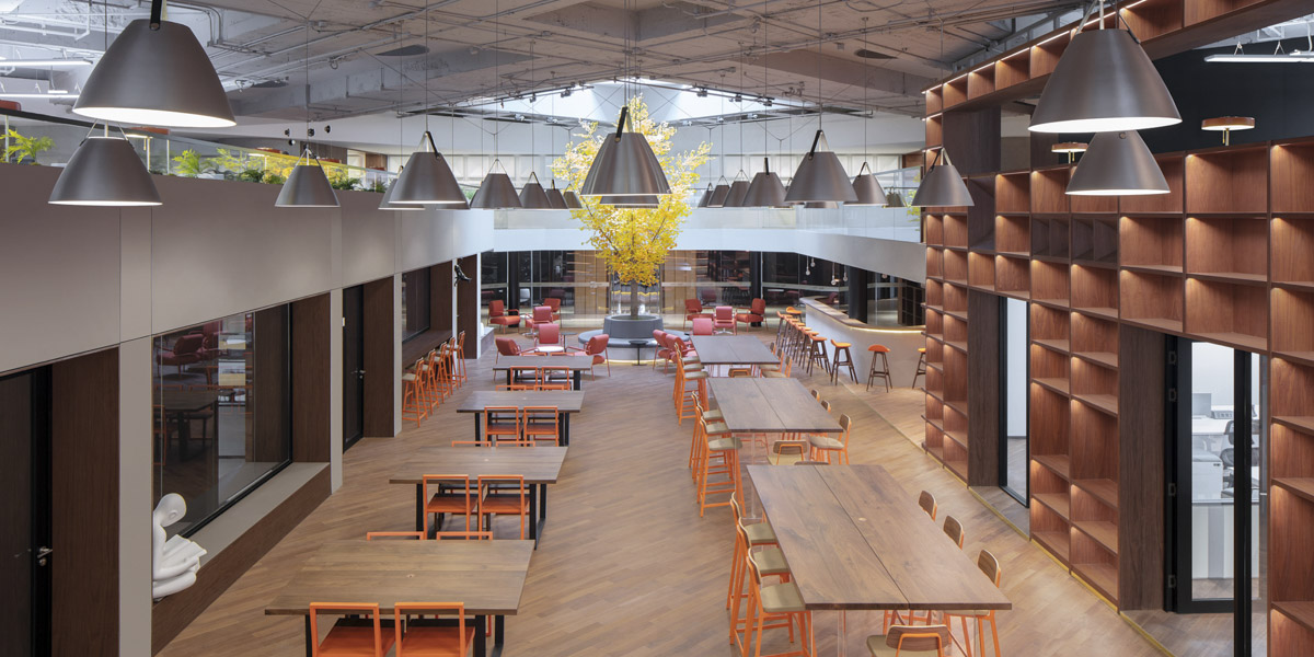 The restructure of the high-ceiling building allowed to open two floors instead of one, creating more functional spaces. The colorful speaker-styled theme has been inspired by a media center designed by anySCALE. By university style and plump golden ginkgo tree in the center of the courtyard, designers strived to bring rejuvenating energy into this place. Above it, through the open sky well, the lights come into space.