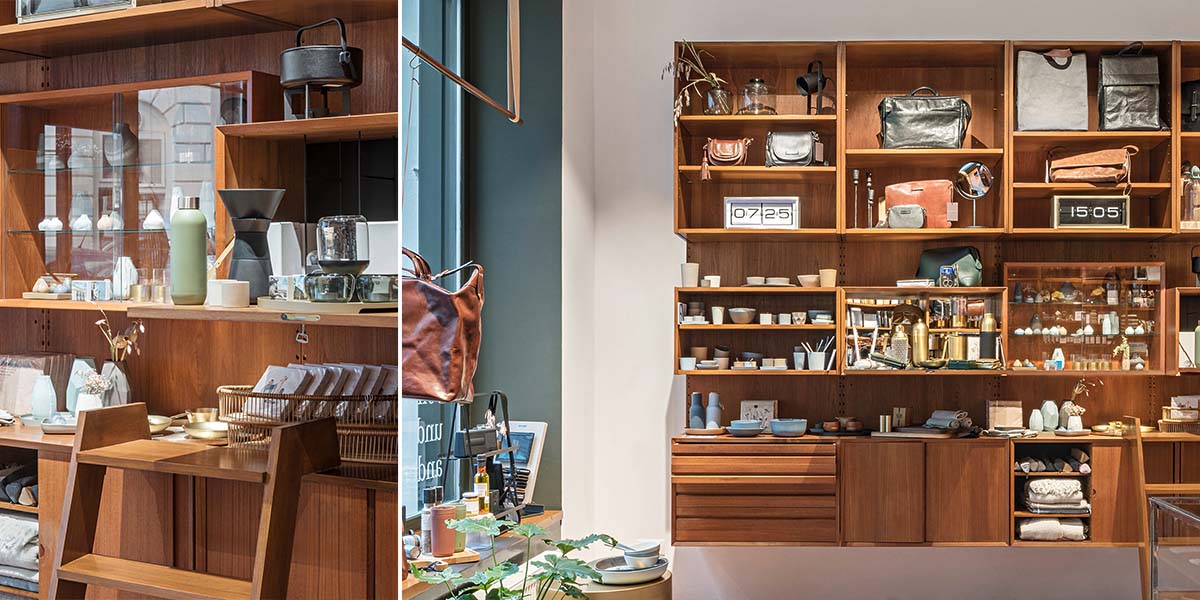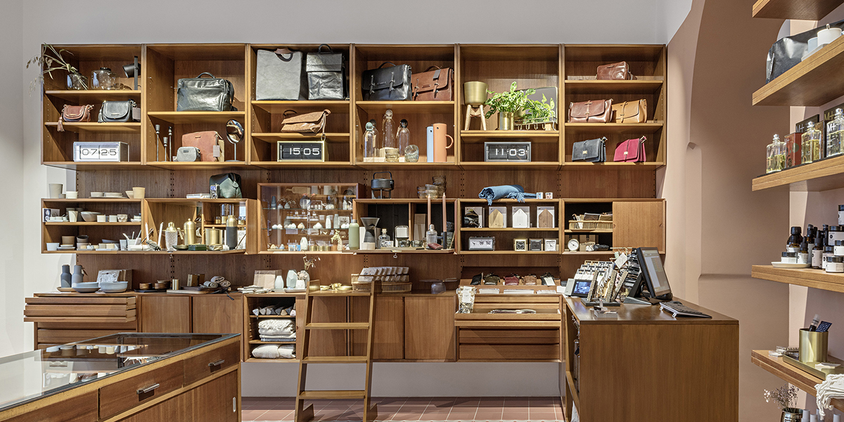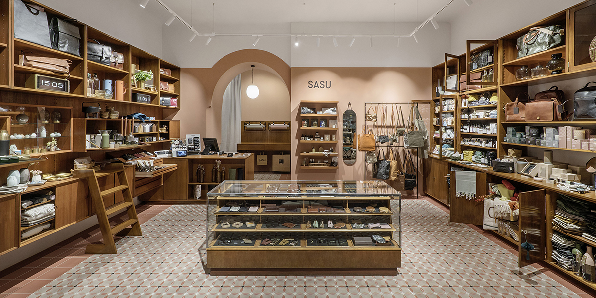 Apart from a low, freestanding centerpiece, the center of the customer space is kept open to allow comfortable movement in the relatively small store. Most of the displays are along the lateral walls, housing SASU’s lifestyle products of various shapes, sizes and materials. To optimize these display areas, anySCALE played with a combination of different display types, sizes and densities. Custom wooden shelves, cabinets, drawers and glass window boxes were made from locally sourced vintage furniture pieces, specially tailored to display the diverse merchandise. The backwall features an eggshell color that complements the wood shelves, which adds to the warm, feminine atmosphere. A decorative pendant light hangs from an arch above the cashier’s table, highlighting the packaging nook that serves as a buffer between the public and private spaces. The realized design imbues the space with an old and homy feeling that fits the city and the brand.