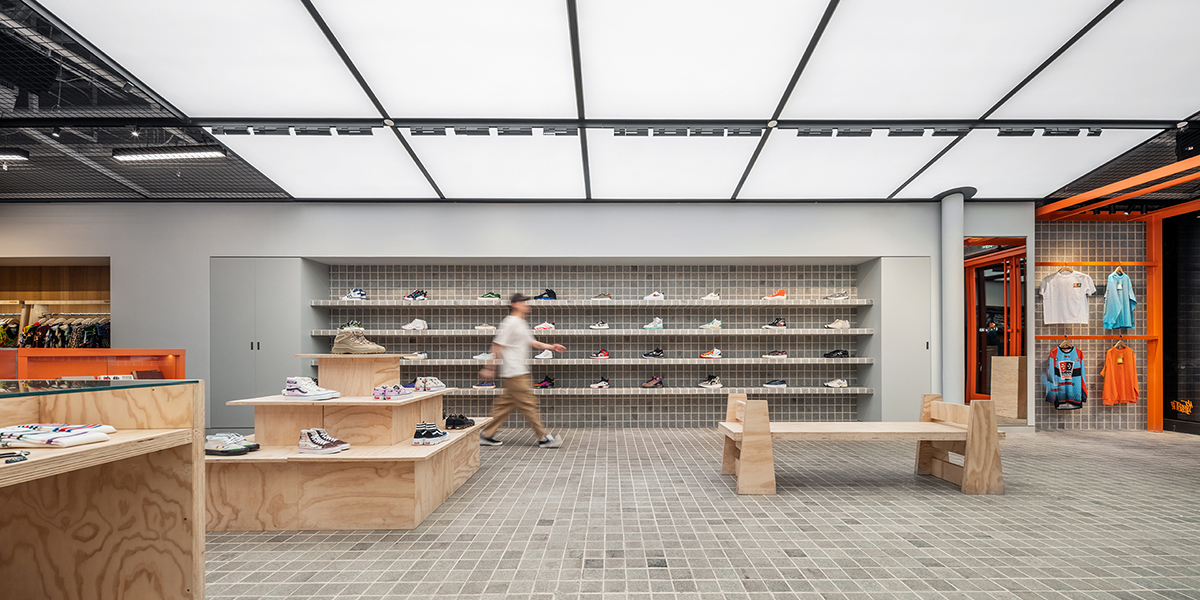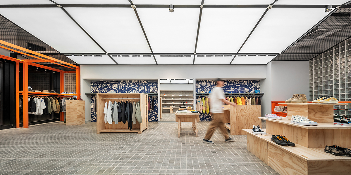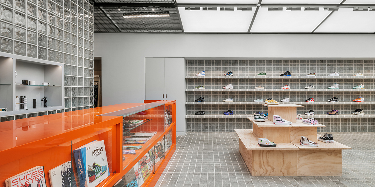 At the back, the storage and changing rooms are behind a long, orange cashier’s counter, made private with cloudy glass bricks. These translucent bricks allow light to pass through, making the space feel larger and brighter while also conveying the concept of roughness and transparency. The integration of unadorned, utilitarian materials throughout the design creates a workshop feeling, where designers are physically creating products of art for people to enjoy. Unassuming and unpretentious, it is a design concept that is also executed with precision and artistry.