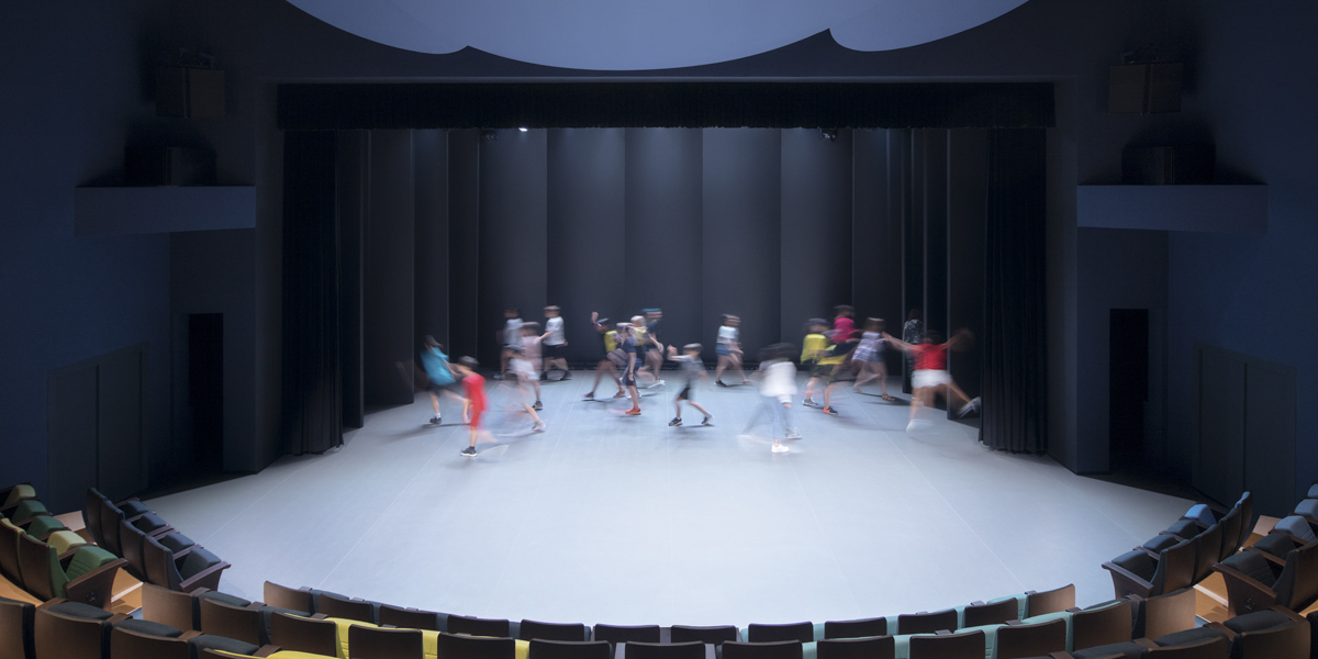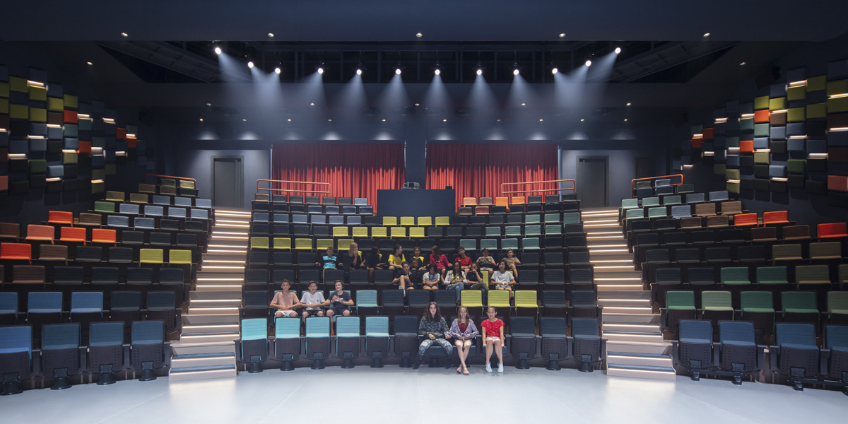 The Western Academy of Beijing has been revitalizing its various facilities, the Blue Theatre being one such part of this rejuvenation process. The name of the space – the Blue Theatre – was set, but the pre-existing interior did not refer to it. Taken from a children’s book called “The Rainbow Fish,” the epithet alludes to a story where a beautiful fish gives his scales away to other fish as a sign of friendship.