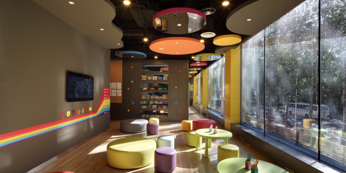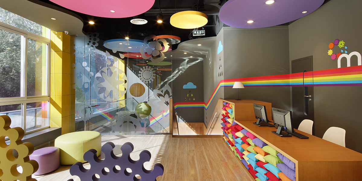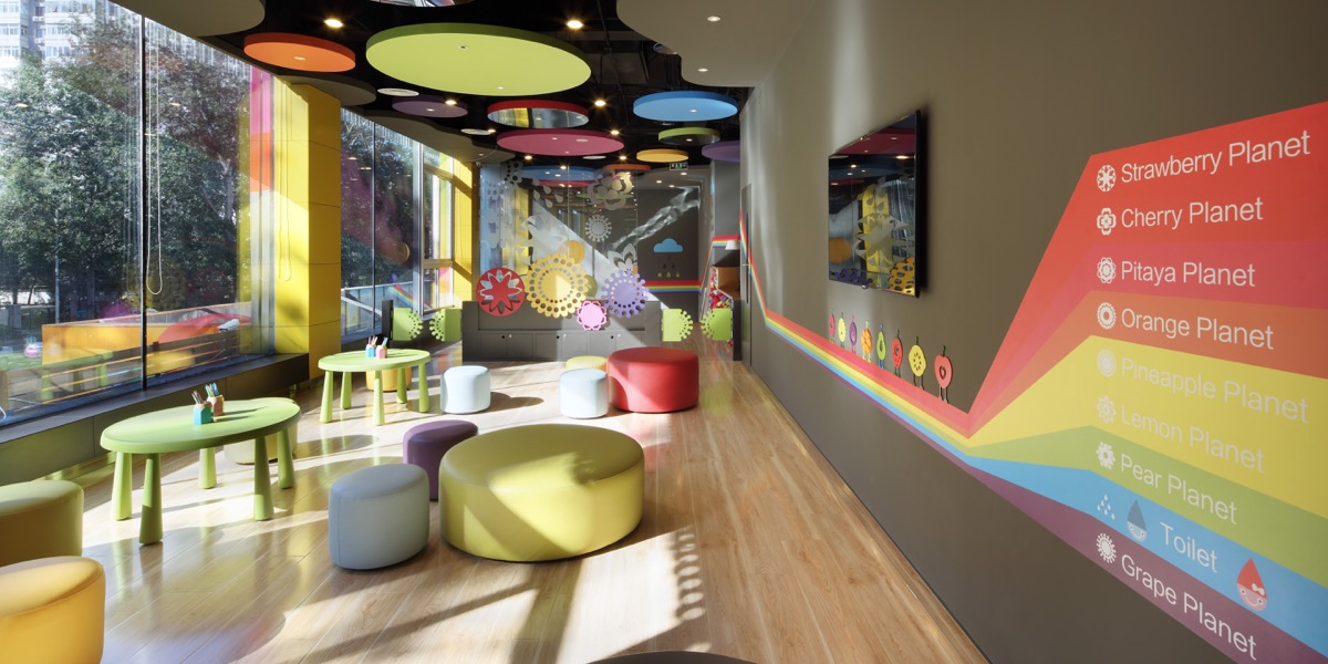 The School accepts children from the ages of 2 to 6. Use of colour as part of the design is hugely beneficial for learning at that age, making the boring classroom space come alive with interest. Using the themes of colour, travel and planets, lead project designer Tom Chan developed the design concept of “Fruit Planet”. Tom introduced the idea of travel through the use of a special passport and stamp. Every class was a different Fruit Planet and in total there were 8 planets. Every planet adopted the colours of it’s corresponding fruit. Every child was a citizen of a Fruit Planet. All the children had badges and passports for their corresponding planet classroom. When moving up a grade, the child received another badge and passport; and he/she would graduate once all 8 had been collected. This teaching idea was entirely consistent with the design of the space, completely overturning the former teaching model. “Rainbow Bridge”- bright rainbow lines painted on the walls - created a pathway that connects the Earth to the Fruit Planets. Like a way-finder, each colour of the rainbow leads to a different classroom.