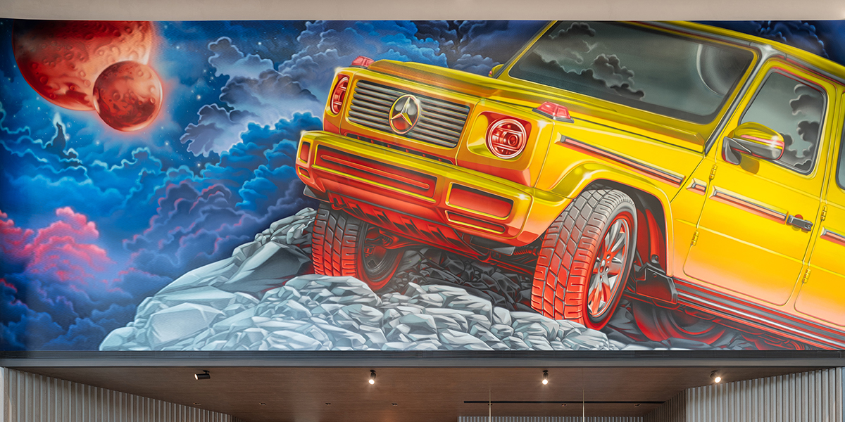 The G Studio features unique installations that represent natural elements, such as the 45-degree “rock” ramp and the branded 'Ice Wall,' which showcase the car's off-road capabilities and ability to conquer extreme terrain. Meanwhile, a massive graffiti mural on the other side of the studio reflects a metropolitan environment, embodying the brand’s more recent, urban focus.