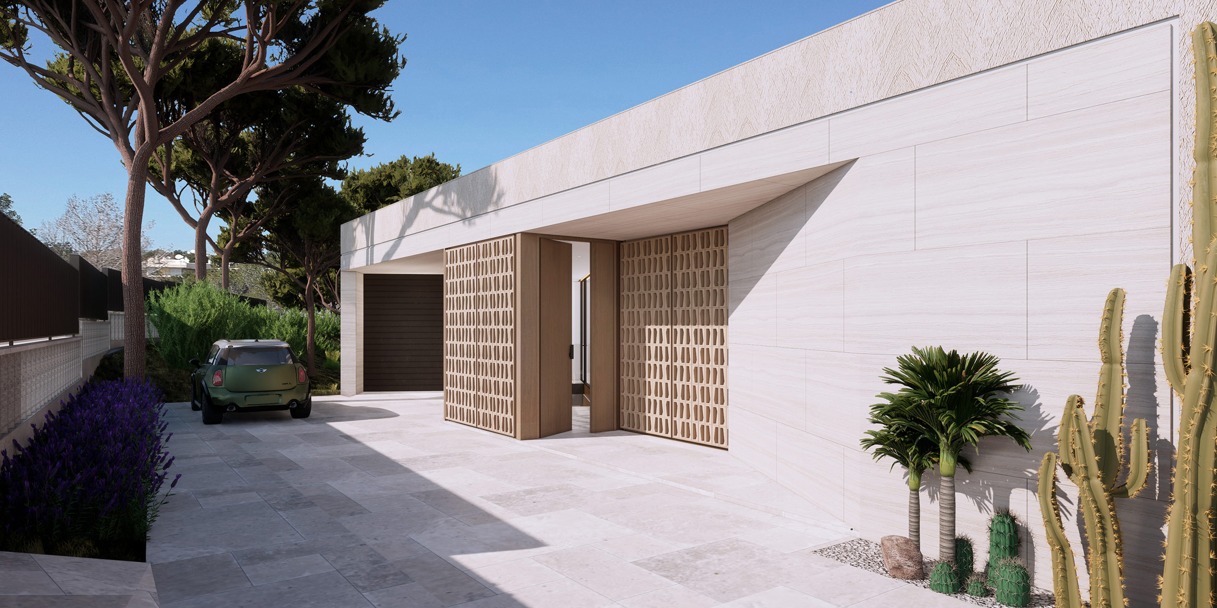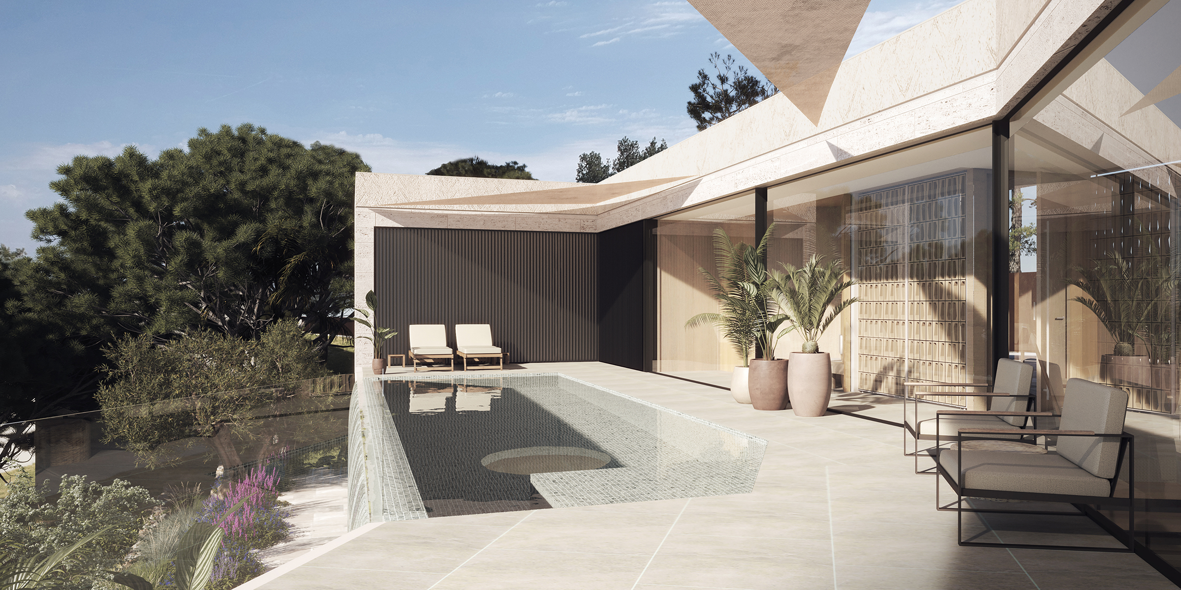 With carefully curated openings—each framing a specific function and view—the architecture assumes the presence of a sculptural stone form, anchored into the hillside. Subtle travertine frames accentuate each aperture, lending refinement and precision to the cubic volume, while a sand-toned plaster finish gives the structure a discreet yet powerful sense of place.