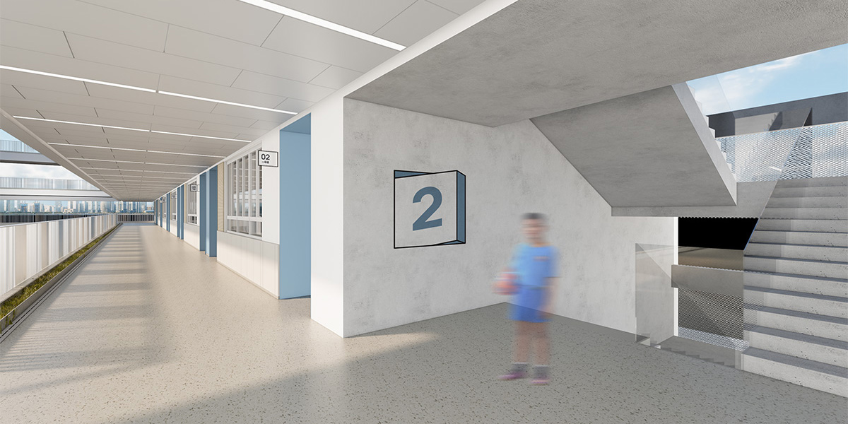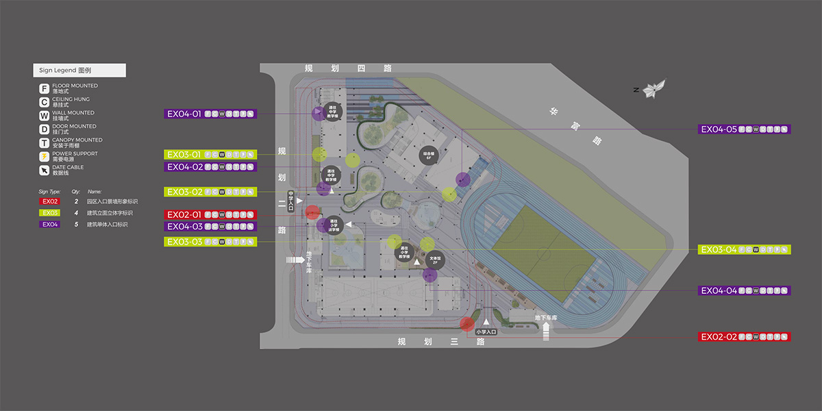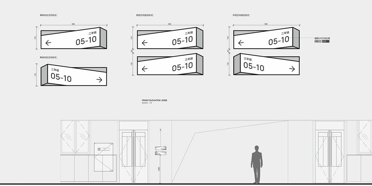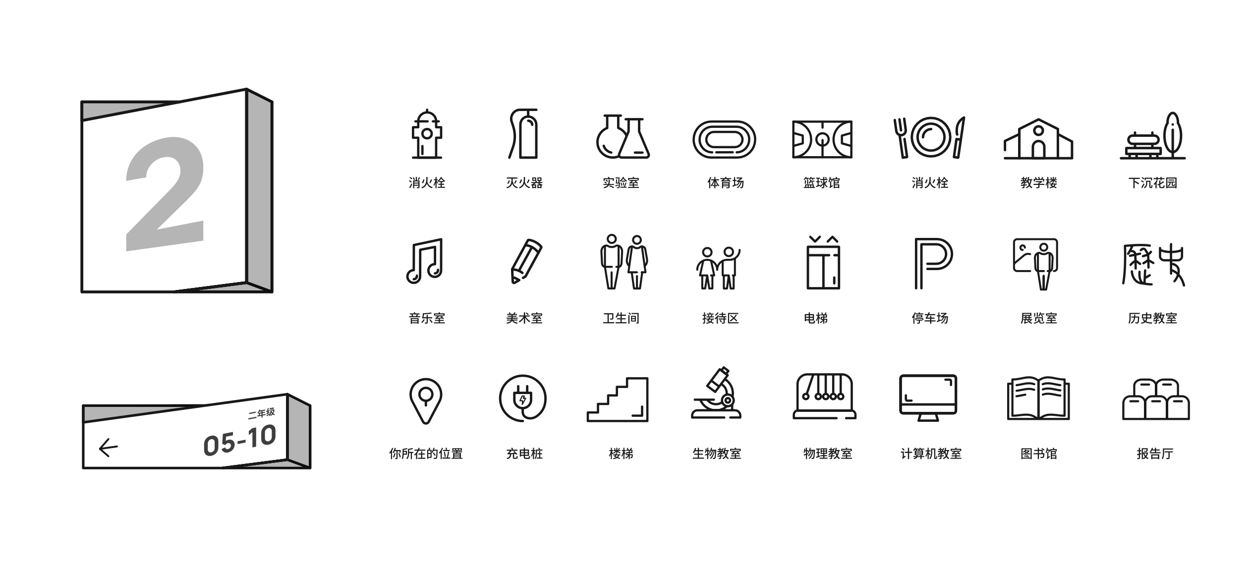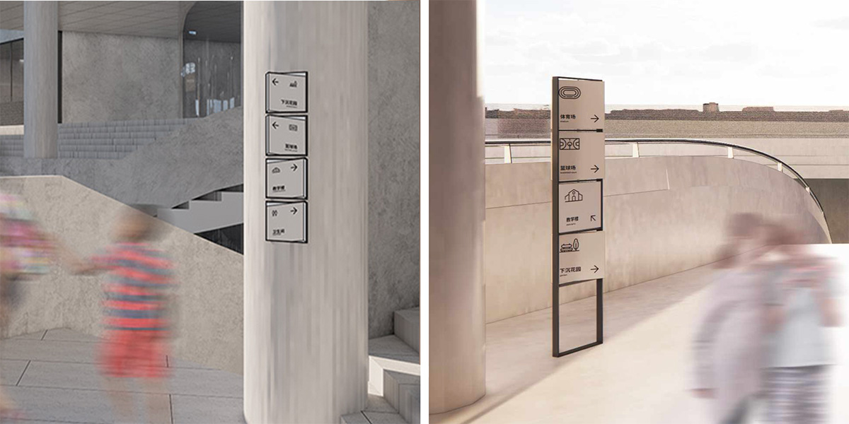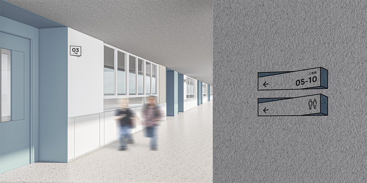In the primary and secondary school stages, the language becomes cleaner and more precise. Floor numbers are embedded as three-dimensional volumes within the architectural surfaces, reinforcing spatial anchors. Classroom numbers and directional information are presented with clear contrast and standardized layouts, ensuring clarity and efficiency. The overall expression is rational and restrained, making spatial logic immediately legible.