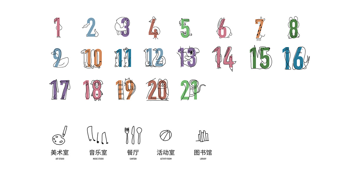 In the kindergarten, the signage emphasizes playfulness and emotional perception. Numbers are paired with figurative animal characters, giving each classroom a distinct identity and color memory. Children build spatial awareness through graphic recognition and visual association. Signage height and scale are set according to children’s eye level, integrating with bright corridor colors so that wayfinding becomes a visible and engaging part of the environment. Here, signage is not only guidance, but companionship.