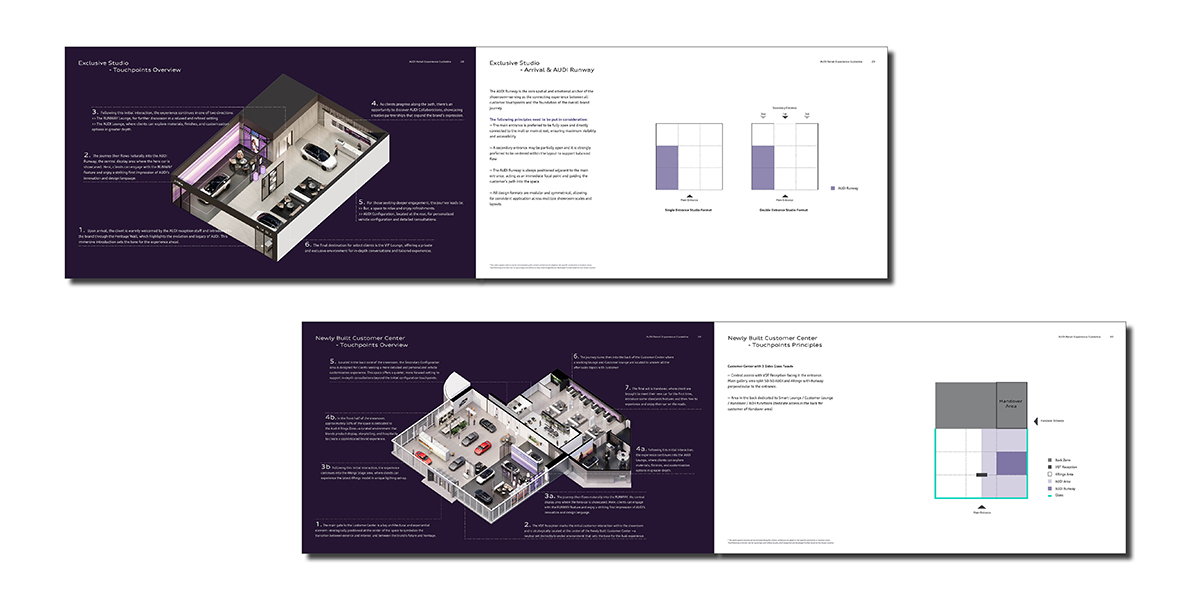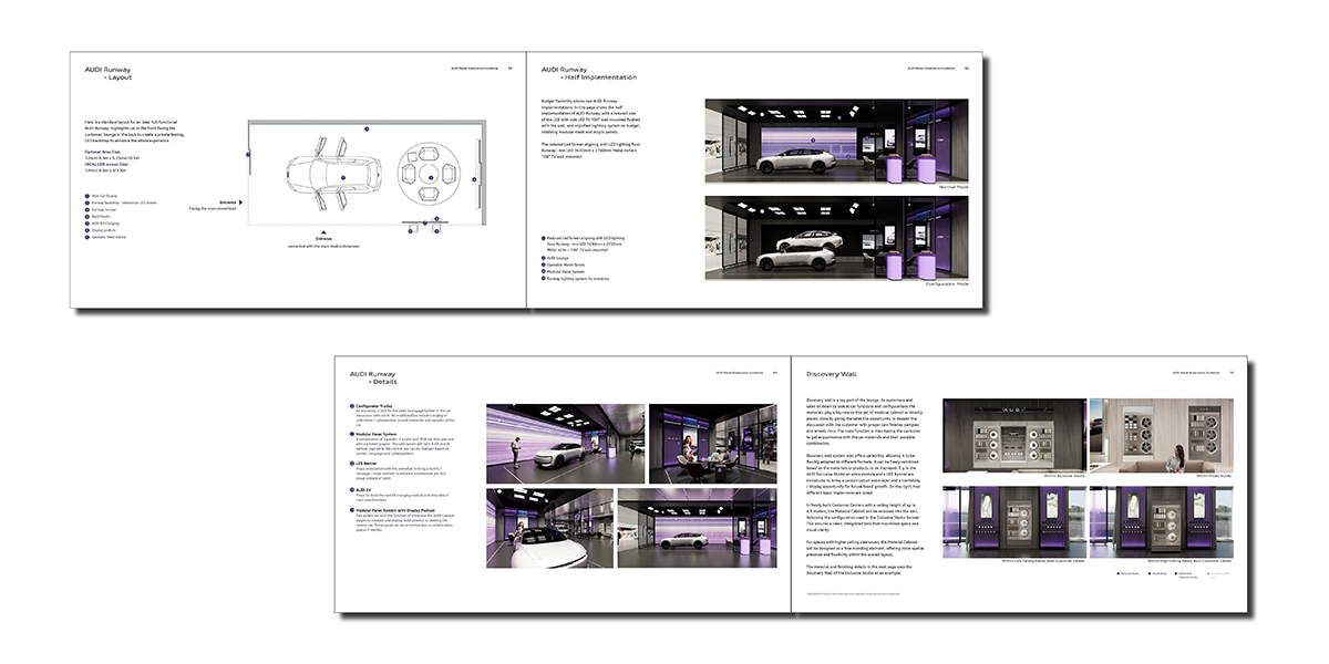 The spatial concept centers on the AUDI Runway—a core installation combining stage presence with digital immersion. The design guideline translates this “central stage” into executable standards by defining proportions, lighting logic, and digital interface integration. As a result, the AUDI Runway becomes a scalable, adaptable core module rather than a one-time installation.