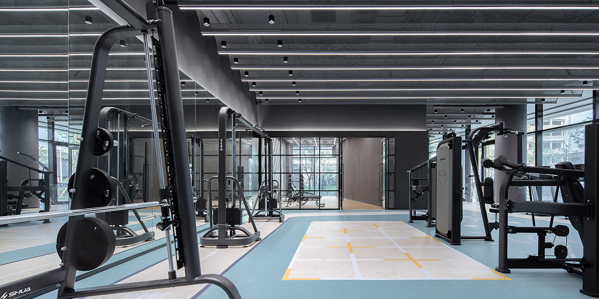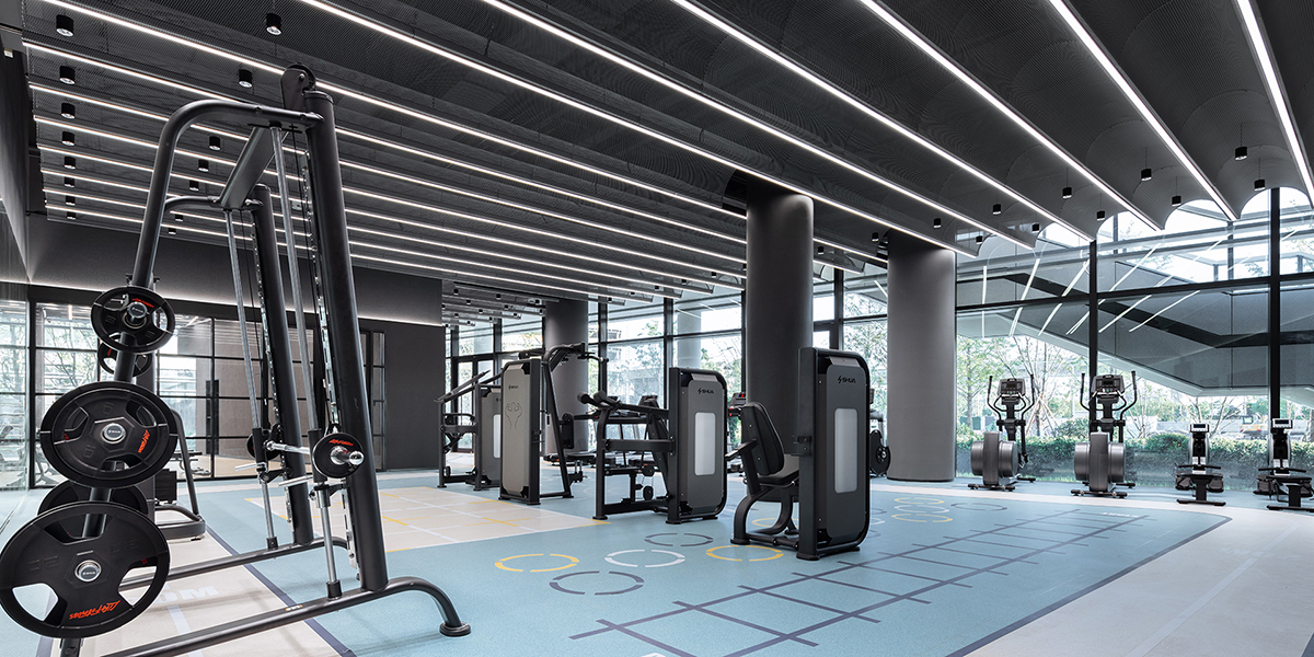 设计师采用简洁的的中世纪艺术拱顶风格,采用金属网的材质营造连续的拱顶天花,跨越了整个开放的训练区域。 同时还内置了线性照明,营造了一种和谐专注而又能量饱满的训练氛围。 运动型 PVC 地板采用长三角赵巷新兴产业园的品牌颜色,受到经典健身房启发,地面采用更简约的设计语言,集成了跑道标记以及运动区域符号,并就此形成独特的视觉导视。