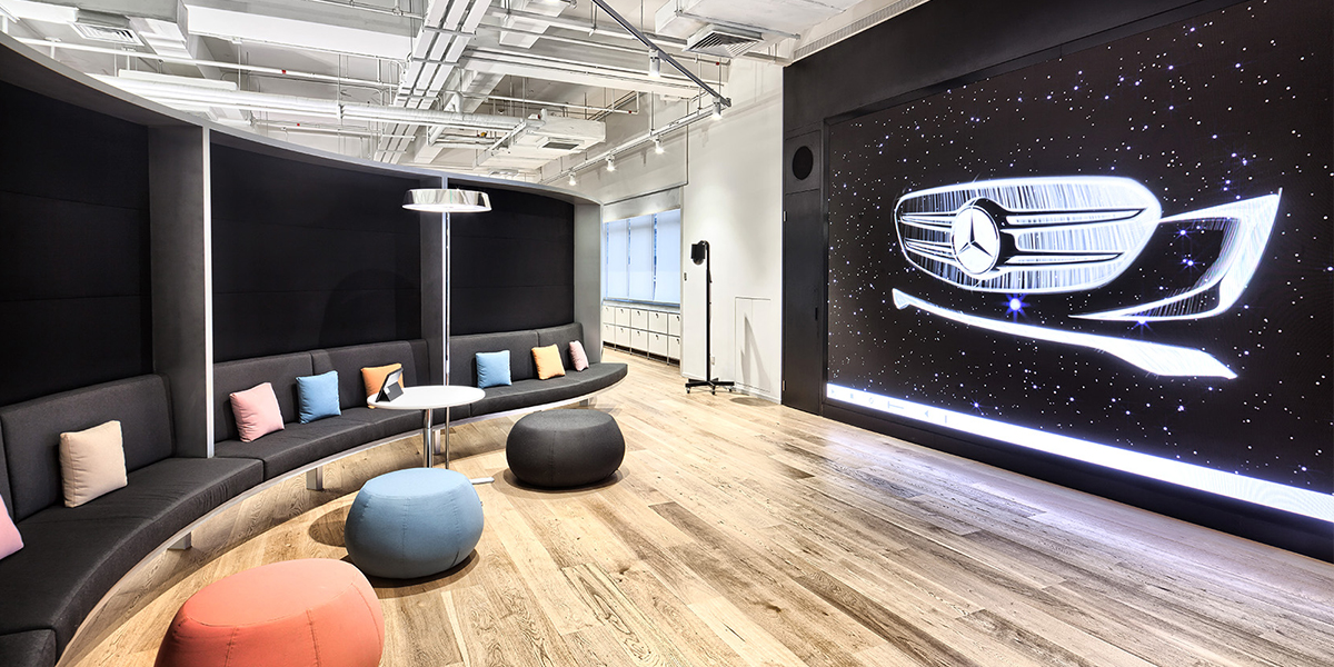 The focus for Mercedes-Benz Advanced Design Centre was on communication and frequent interaction between the various users of the spaces. The idea of a small village was adopted; a community that frequently interacts with one another and - due to the sensitive nature of their work - is able to keep communications strictly internal.