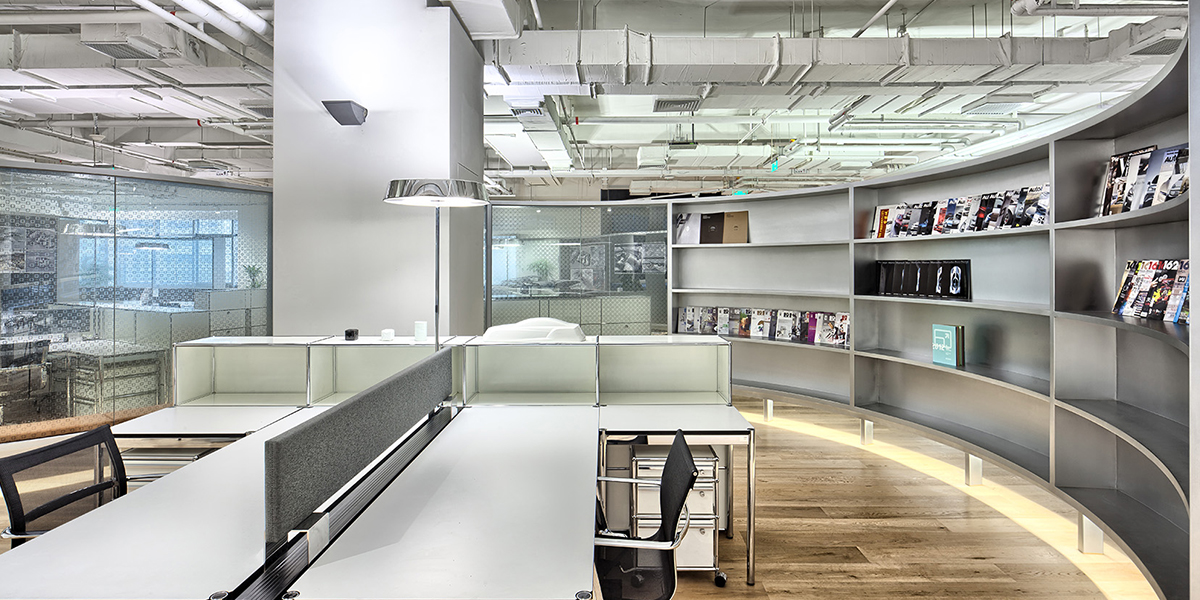 看似立体悬空的弧形玻璃墙,将设计空间做了分隔,却不完全封闭。玻璃隔断内为设计师的工位,外侧则被智慧的利用起来,创作出舒适的角落,包括多媒体区,图书馆以及咖啡吧。自然的橡木地板和白色的裸顶天花,与纯黑色的墙和铬色装饰镶边起到了互补平衡的作用。