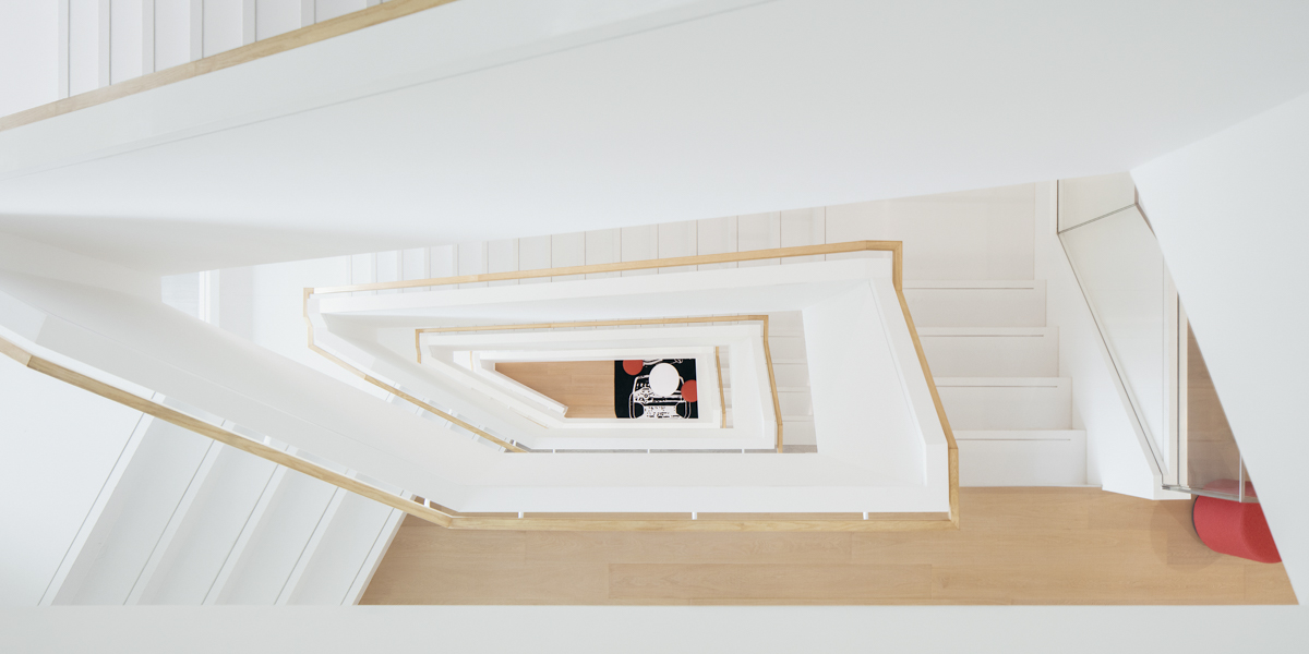 To reflect this heritage, we constructed on the public meeting floor a model car timeline along the wall, an engine block display, a trophy display case, shelves containing scale models, and a 1:1 scale mock-up of the 919 series Porsche racecar. The staircase was of particular importance as it spoke directly to the themes of speed and passion for the Porsche brand and also served as a major meeting point to foster communication and collaboration among the employees.