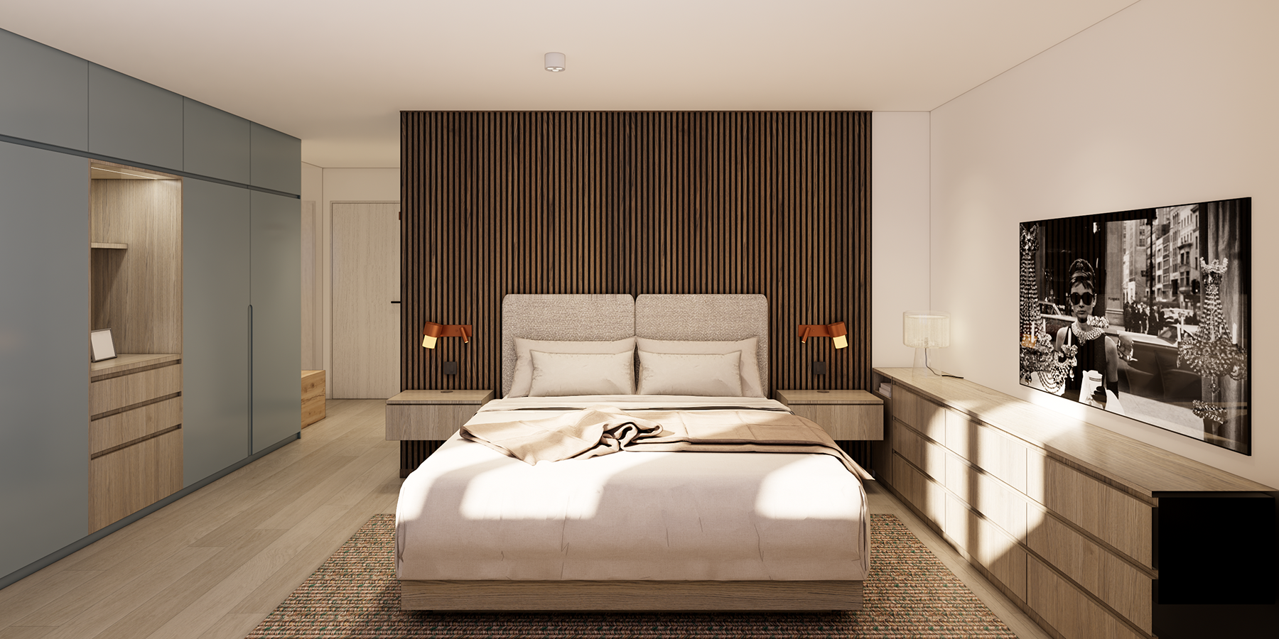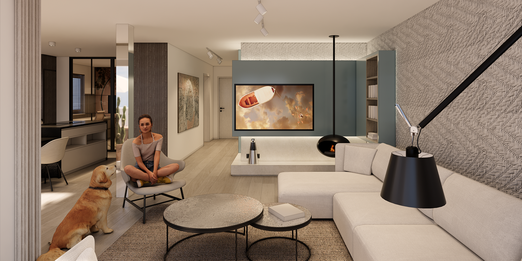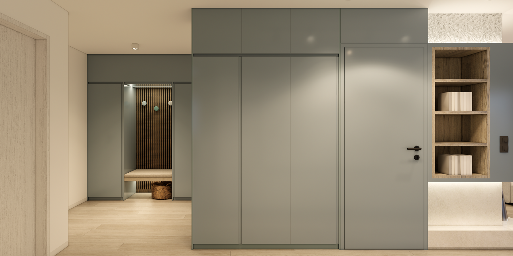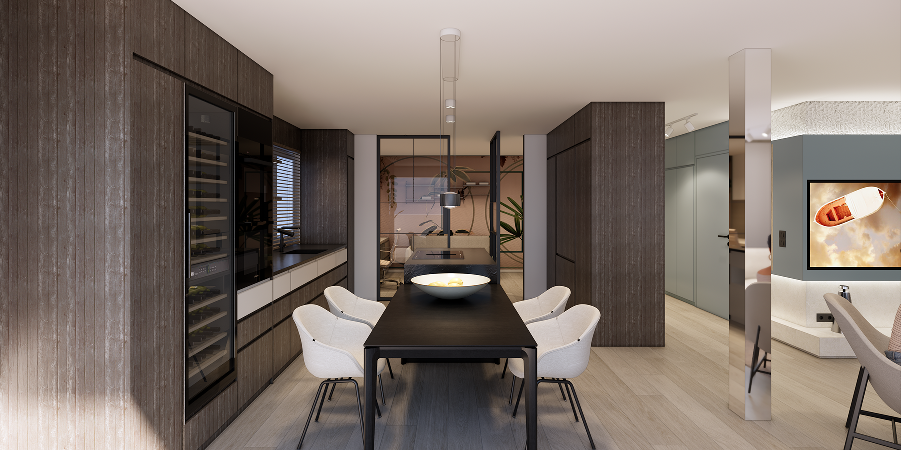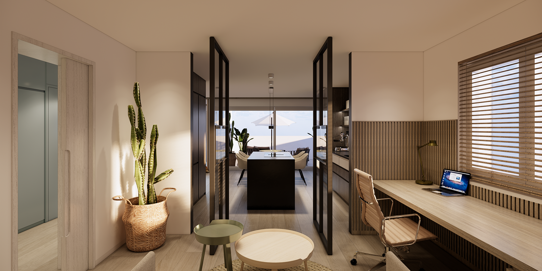The entrance is defined by a modulated built-in furniture wall that wraps around the guest bathroom and guides the flow toward the main living area. The open kitchen is complemented by an integrated dining table facing the loggia, while an adjacent studio offers space for remote work. This arrangement allows for fluid communication across all open zones while maintaining a clear sense of separation and purpose within each area — the same principle applied to the master bedroom and its en suite bathroom.