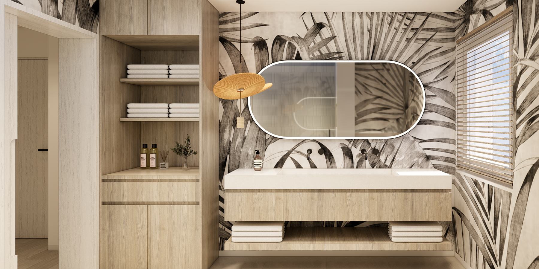The material palette blends southern warmth with subtle Asian influences, bringing a touch of the tropics to central Germany. Tropical wallpaper motifs combine with three-dimensional dark timber surfaces and pigeon-blue lacquered cabinetry, all set against a calm, neutral background to create an atmosphere that feels both refined and inviting.